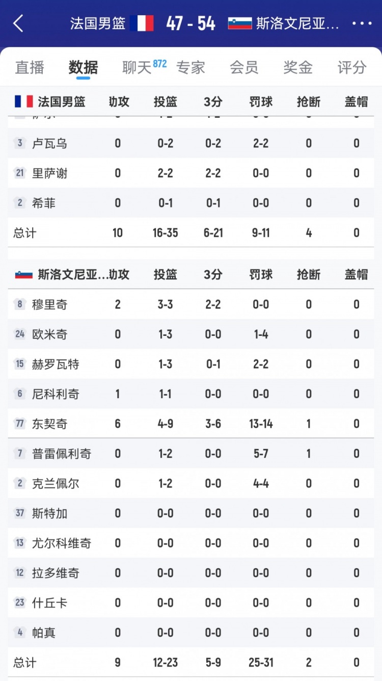 上半场,法国男篮11罚9中,而斯洛文尼亚赢得惊东谈主的31次罚球,掷中25个,其中东契奇个东谈主14罚13中。