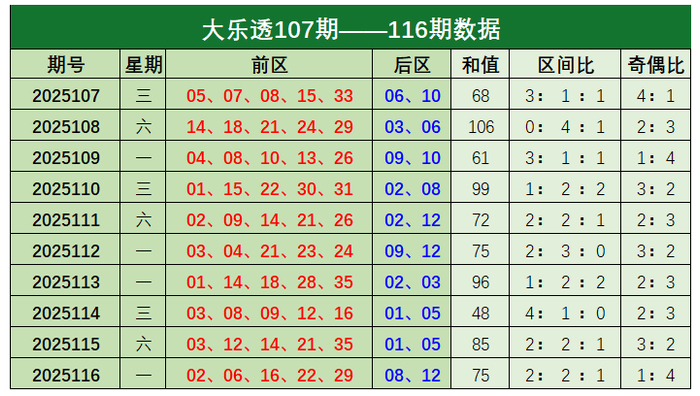 大乐透第2025116期出奖号统计:前区02、06、16、22、29,后区08、12。和值为75,区间比为2:2:1,奇偶比为1:4。